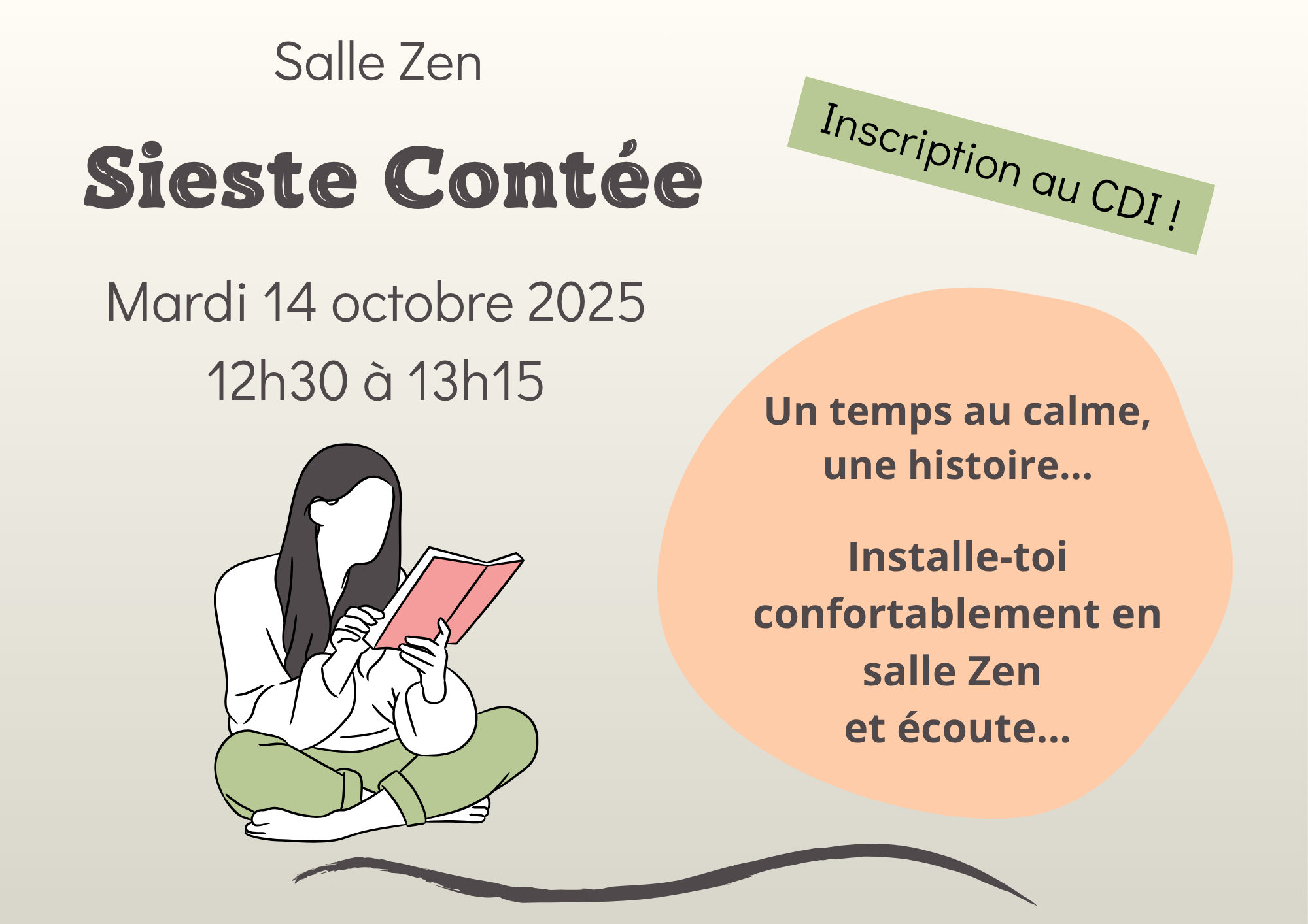 Envie d'une pause après le repas ? Nous vous proposons une sieste contée le Mardi 14 octobre sur la pause méridienne en salle Zen.