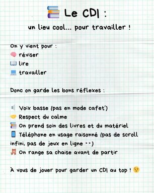 📚 Le CDI : un espace pour réviser, lire et travailler dans le calme. Merci de respecter les règles pour en profiter pleinement.