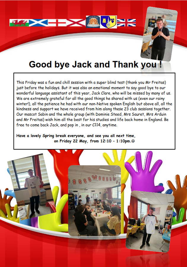 mais aussi un dernier au revoir à notre assistant de langue, Jack Clare, avec qui nous aurons passé une année inoubliable.