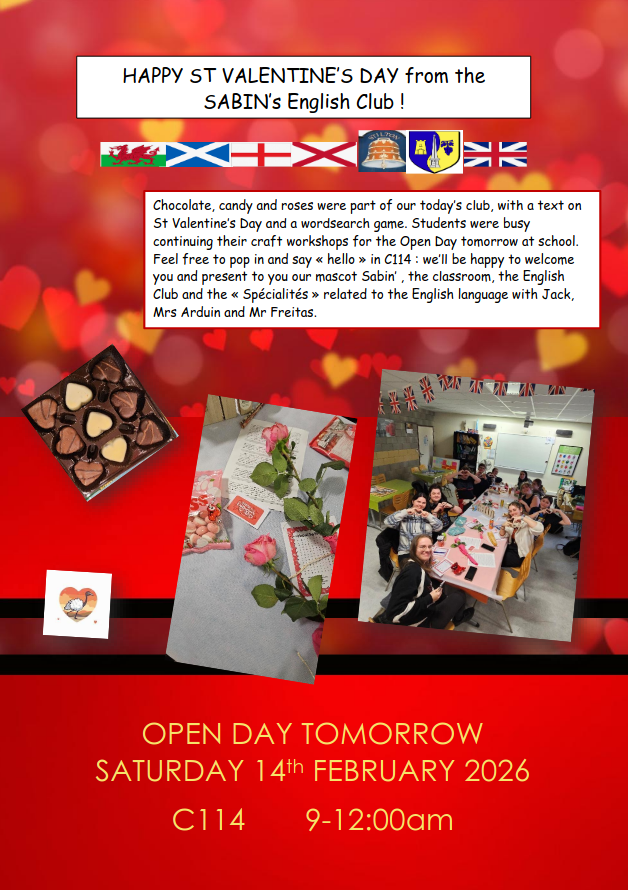 Nous vous y attendons nombreux et vous souhaitons la bienvenue en C114 demain de 9h à 12h pour vous présenter notre mascotte Sabin', la salle de classe, le club d'anglais et vous renseigner sur les spécialités liées à l'anglais!