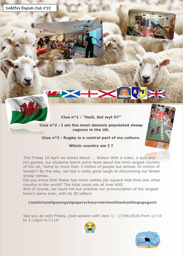 C'est aussi le pays qui a la plus forte concentration de châteaux au km2, avec plus de 600 édifices, et bien sûr, nous y trouvons aussi le nom de commune le plus long avec ses 58 lettres, vous l'aurez deviné sans doute, nous avons parlé du Pays de Galles ce vendredi 20 avril avec le SABIN's club.