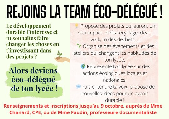 Par LAURENCE FAUDIN, publié le mercredi 24 septembre 2025 10:59 - Mis à jour le mercredi 24 septembre 2025 10:59Un lycée éco-responsable, c’est possible. À toi de jouer ! Deviens éco-délégué ! Inscriptions jusqu'au 9 octobre 2025 -