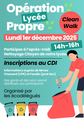 Par LAURENCE FAUDIN, publié le mercredi 26 novembre 2025 13:02 - Mis à jour le mercredi 26 novembre 2025 13:02Les éco-délégués organisent une clean walk lundi 1er décembre. Inscriptions au CDI. -