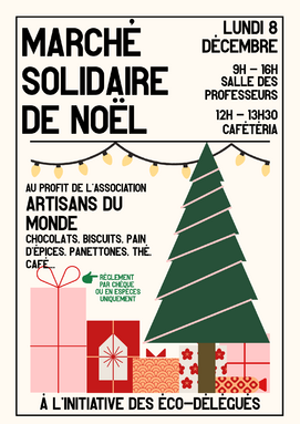 Par LAURENCE FAUDIN, publié le mardi 2 décembre 2025 10:58 - Mis à jour le mardi 2 décembre 2025 10:58L'association Artisans du Monde tiendra un marché solidaire lundi 8 décembre en partenariat avec les éco-délégués. Tous les bénéfices de la vente iront au profit de l'association. On compte sur votre générosité ! -
