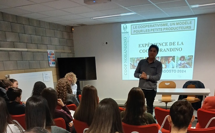 César a expliqué comment la coopérative Norandino accompagne les petits producteurs de cacao, de café et de canne à sucre pour améliorer leurs pratiques agricoles, protéger l’environnement et garantir des produits de qualité. L’intervention s’est déroulée en espagnol, ce qui a permis aux élèves de pratiquer la langue tout en découvrant le quotidien des agriculteurs péruviens.